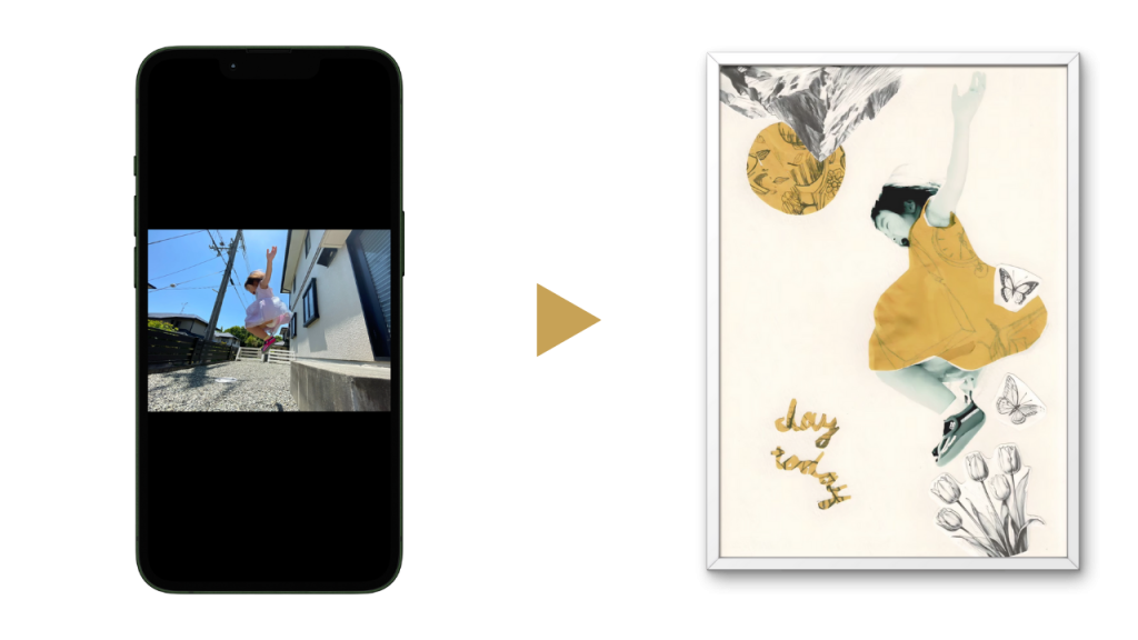 スマホにある思い出の写真を、手描きのスケッチと組み合わせて仕上げるコラージュアート作品。